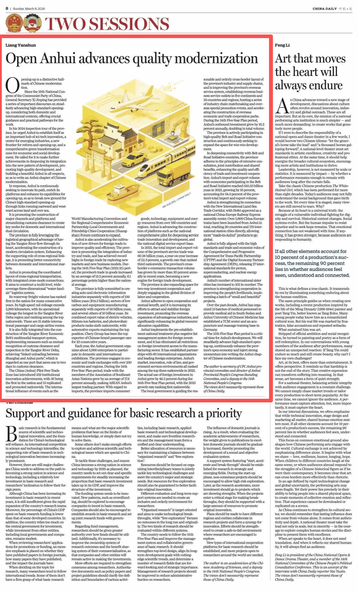3月8日,全国人大代表,安徽省委书记、省人大常委会主任梁言顺在《中国日报》发表署名文章《以高水平开放促进安徽高质量发展》,特别提及我校在德国成立中医药中心及针灸推拿培训基地,展现了学校在服务国家“一带一路”倡议、推动中医药文化走出去、促进中外民心相通方面的行动与担当。(董玉节/审核 陈牧/编发)