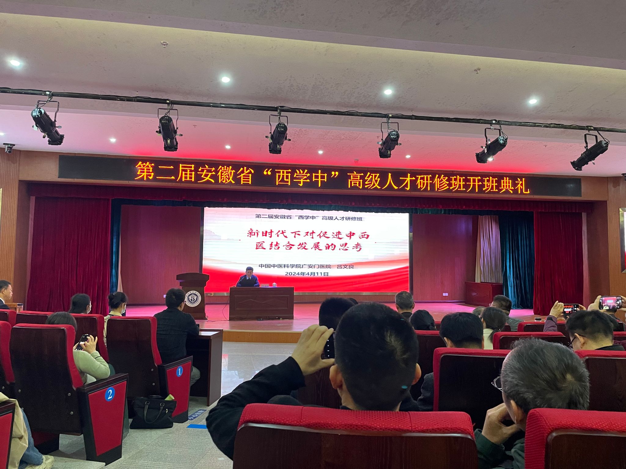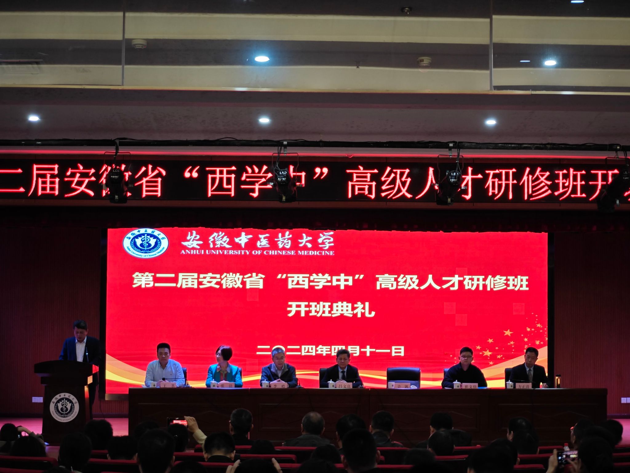 4月11日上午,由安徽省中医药管理局举办,我校承办的安徽省第二届“西学中”高级人才研修班开班典礼在少荃湖校区举行。中国中医科学院广安门医院主任医师吕文良教授,安徽中医药大学党委副书记、校长许钒教授,安徽省中医药管理局中医药发展处处长李皓、副处长崔文佳、一级调研员张洁出席开班仪式。学校教务处处长王茎、继续教育学院院长方正清及继续教育学院全体工作人员、学生代表参加开班仪式。开班仪式由王茎主持。