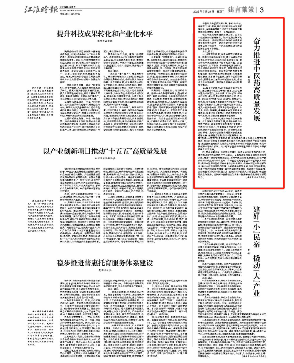 7月29日,省政协机关报《江淮时报》刊发了省政协委员、我校党委书记谢瑞瑾的建言献策文章《奋力推进中医药高质量发展》。