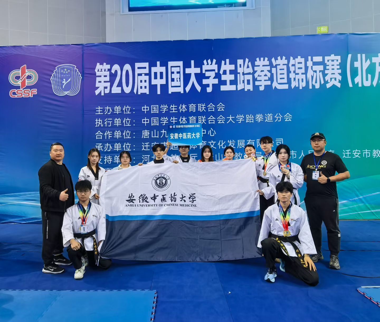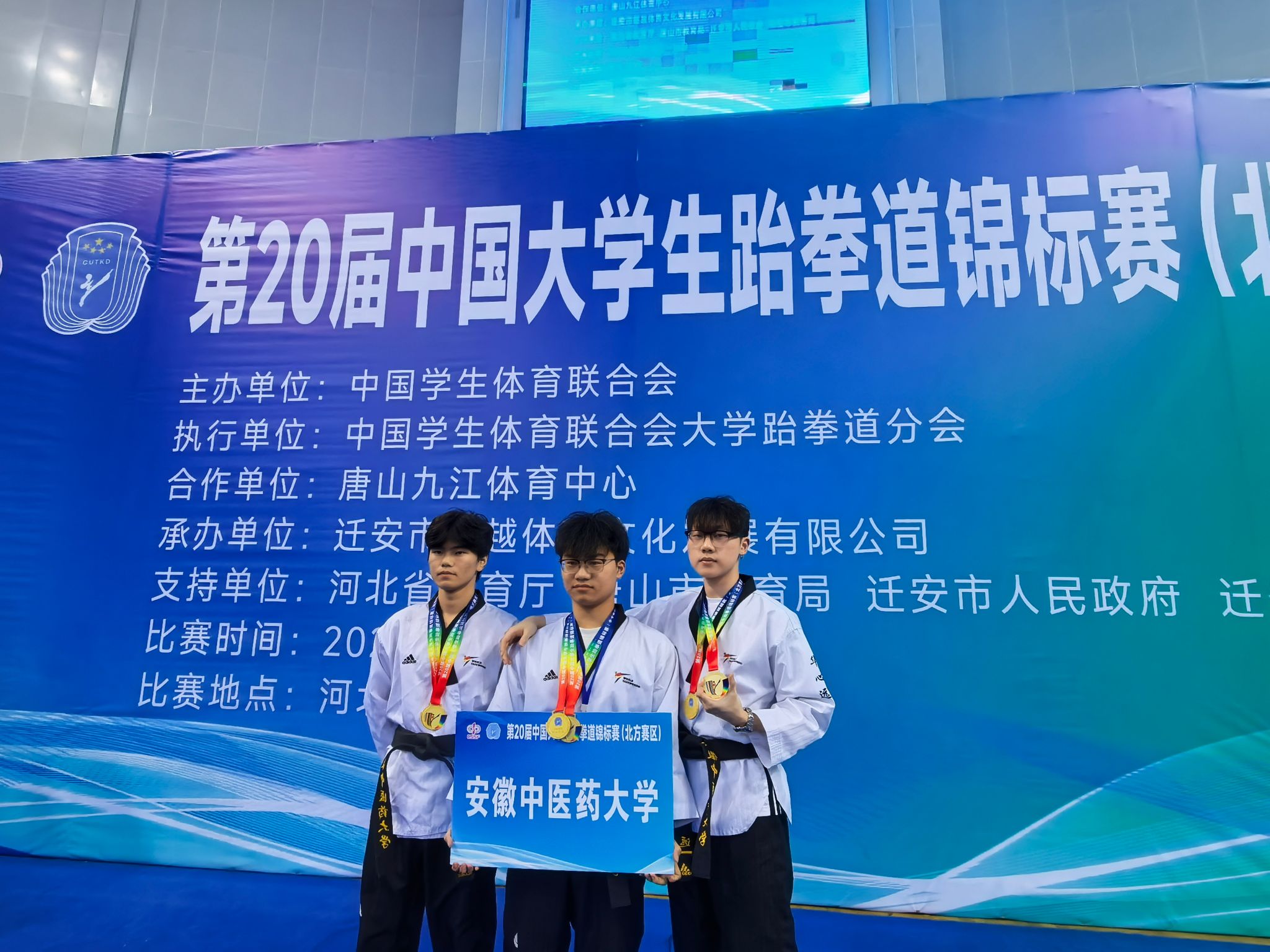 本届赛事由中国学生体育联合会主办,汇聚了全国高校品势、竞技的高水平选手。安徽中医药大学跆拳道队此次表现亮点十足:刘庆乐、台棚、华心远组成的三人团队,在甲组男子三人团体段位品势项目中摘得金牌,实现学校该项目金牌“零的突破”,另在男子甲组三人团体高阶品势中技压群芳,再夺一枚金牌!由潘依慧、翁安琪、罗玉琢组成的三人团队,在甲组女子三人团体高阶品势中收获银牌,又在女子三人团体段位赛中获得团体铜牌。