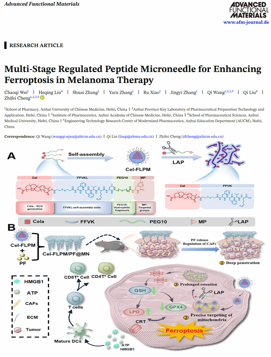 近日,我校药学院程志非研究员、王琪研究员团队在国际著名期刊《Advanced Functional Material》(中科院一区TOP,IF=19)发表题为“Multi-Stage Regulated Peptide Microneedle for Enhancing Ferroptosis in Melanoma Therapy”的研究性论文,2023级硕士生魏超奇、2024级硕士生张帅为共同第一作者,安徽中医药大学为第一通讯单位。